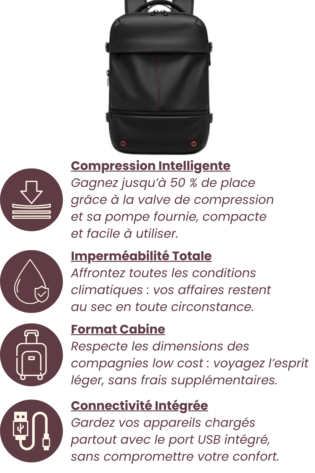Grâce à notre sac compressible, vous gagnez de la place sans rien sacrifier à l’essentiel.