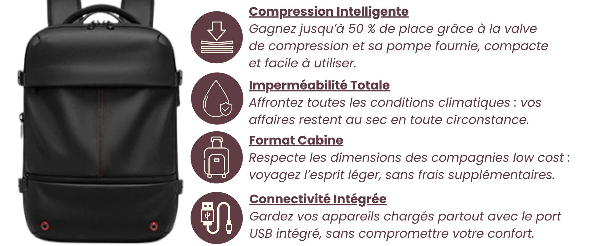Oui : avec ses 30 × 42 × 15 cm (jusqu’à 20 cm après extension), il est conforme aux normes des compagnies low‑cost. Vous embarquez sans frais inattendus.